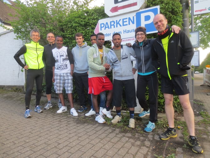 Der ADRAshop veranstaltet seit nun mehr über einem Monat einen Lauftreff beim Hotel Hamm in Herkenrath, das zur Zeit als Unterkunft für Asylbewerber dient. Das Projekt soll Asylbewerbern die Möglichkeit geben, sich sportlich zu betätigen und Kontakte zu knüpfen. Das nächste Etappenziel, so Coach Carsten Bleisch (im Bild links), sei die Teilnahme am Kirschblütenlauf in Bergisch Gladbach. Bei dem Stadtlauf in Refrath ist der ADRAshop seit einigen Jahren regelmäßig mit einer größeren Gruppe vertreten. Wer Interesse hat im Team des ADRAshops mitzulaufen, darf sich gerne bei carsten@bleisch.eu über weitere Infos erkundigen.
