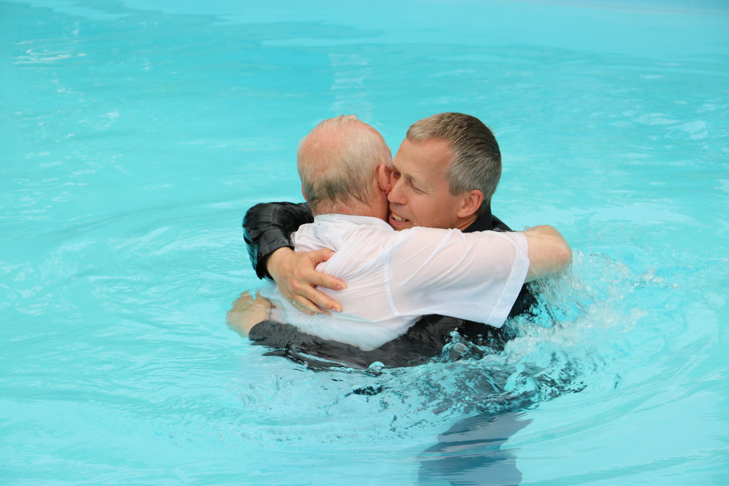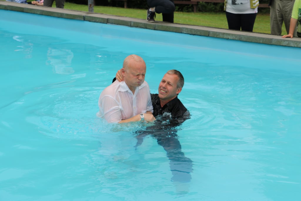 er sich schließlich zur Taufe. "Ich hätte damals selbst nicht gedacht, dass ich heute hier stehen würde," sagt er, als er seine Entscheidung erklärt. Der ehemalige Pastor Adrian Rebega führte die